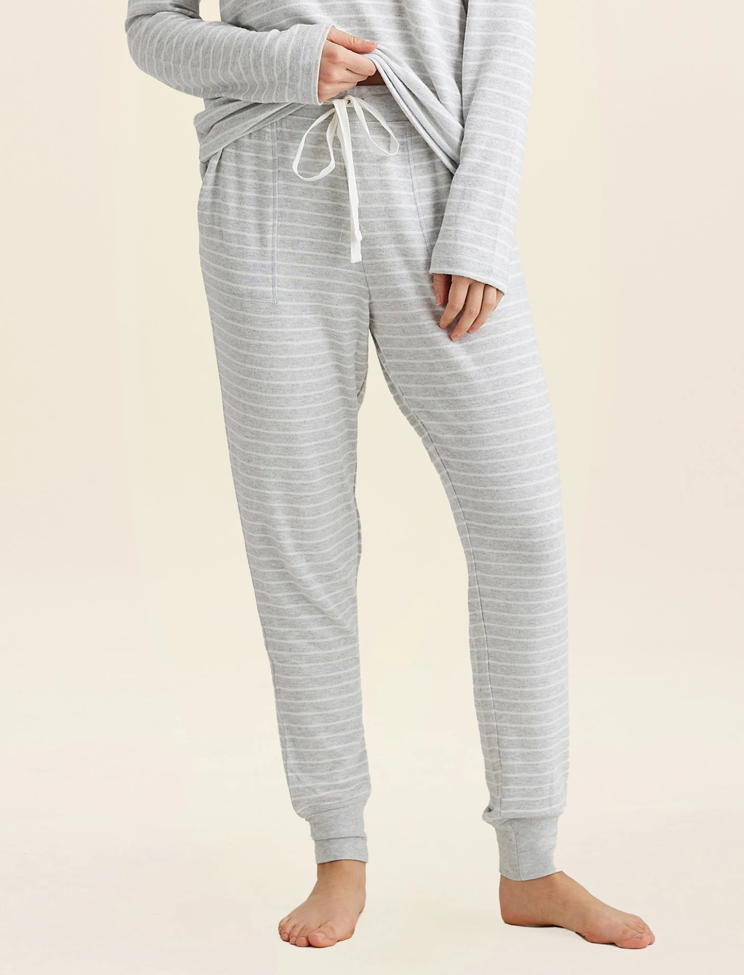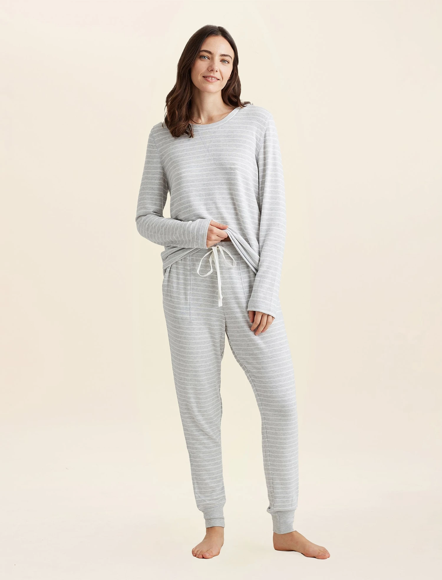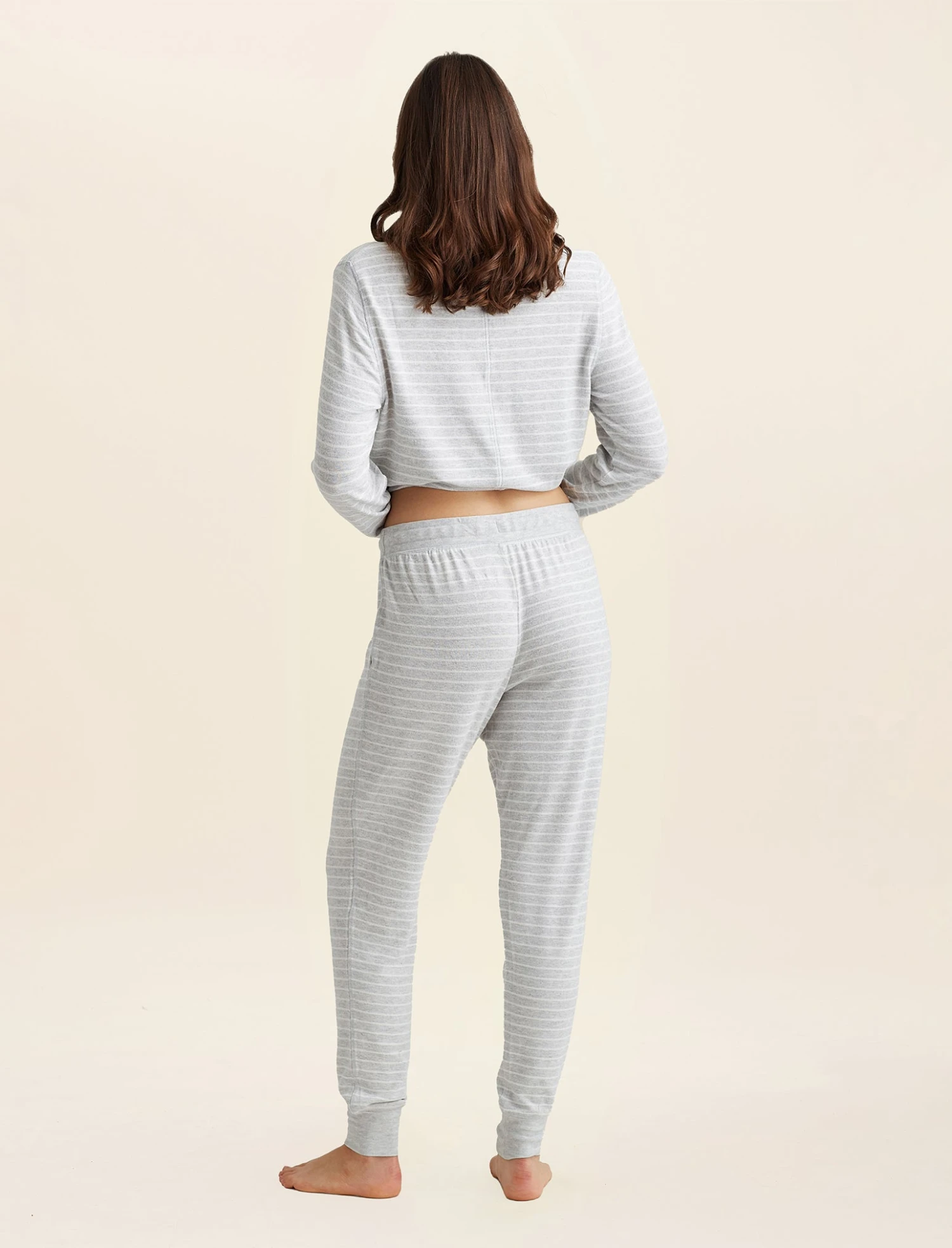 Introducing our Feather Soft Jogger in Grey White stripe, crafted from a soft and lightweight material, provides unparalleled comfort, making it the ideal choice for both restful sleeping and leisurely lounging.