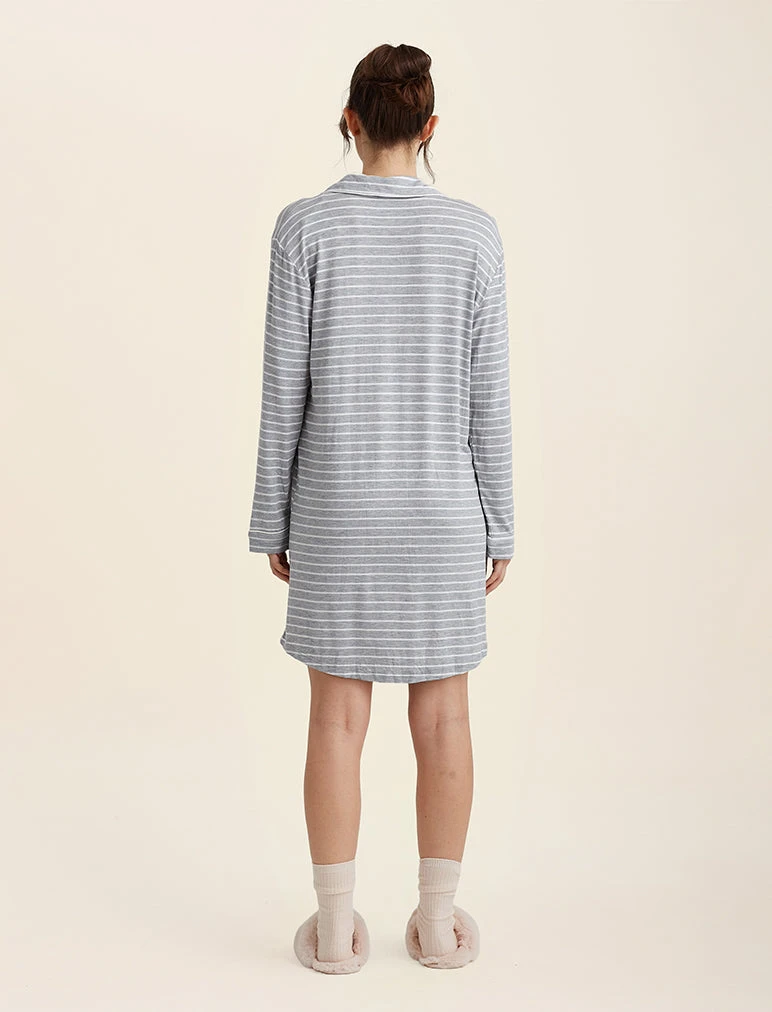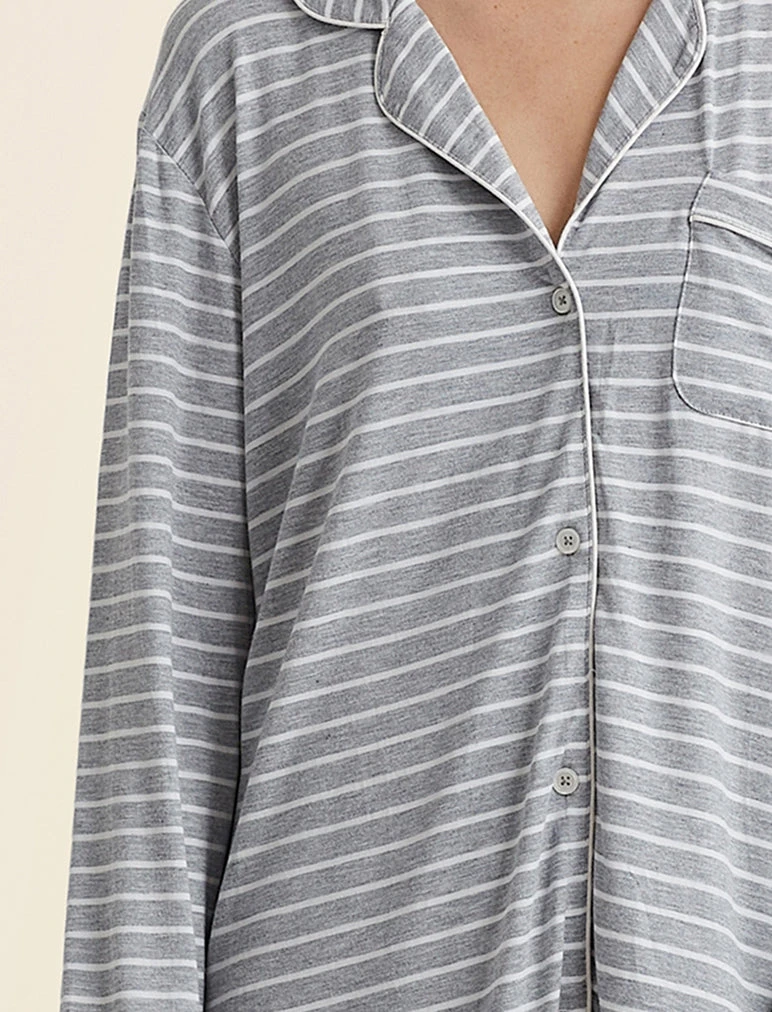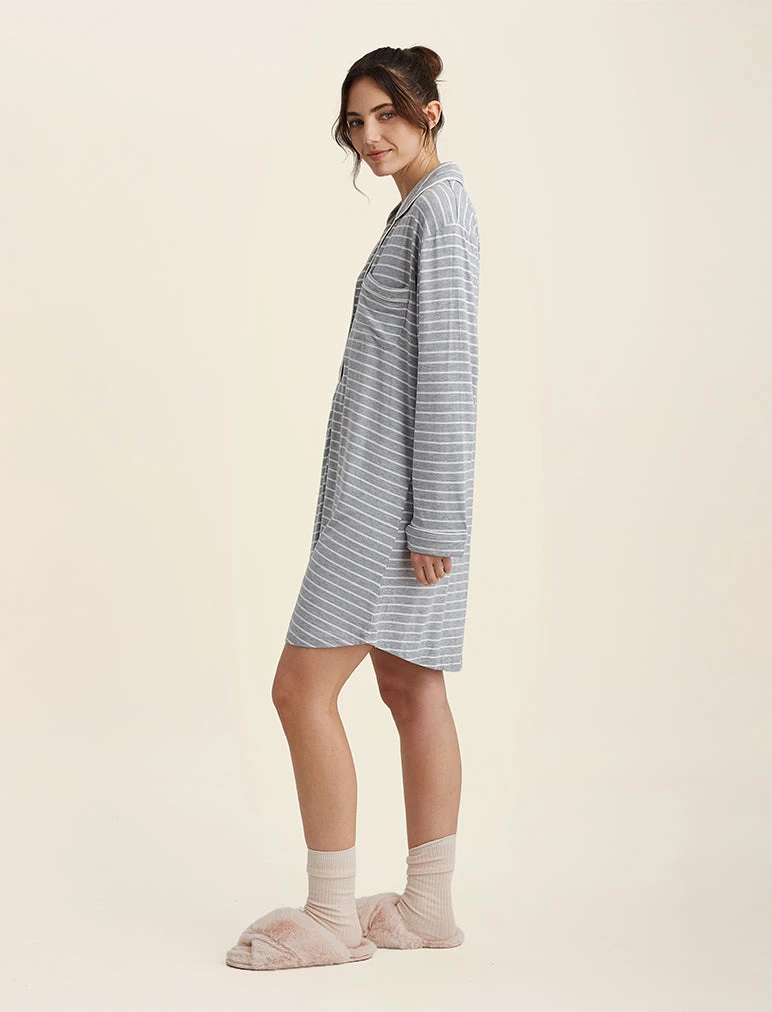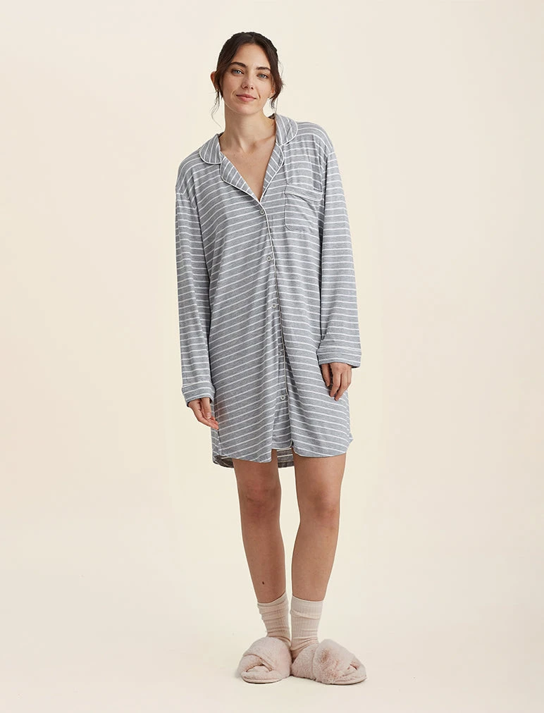 Our Kate nightshirt will be your new favorite! Made from the luxuriously soft Modal, you’ll find it hard to get out of bed. Now available in a beautifully delicate Grey Stripe.