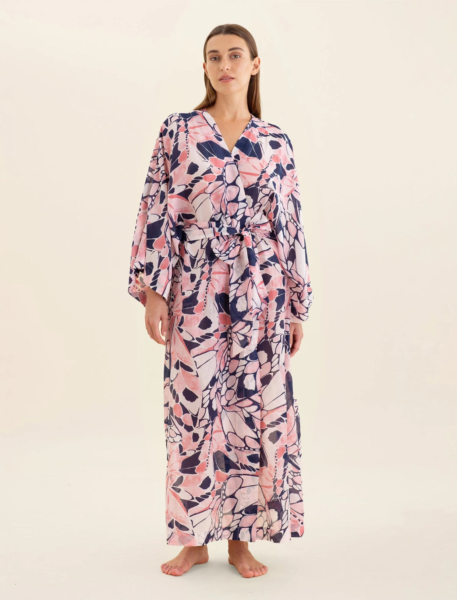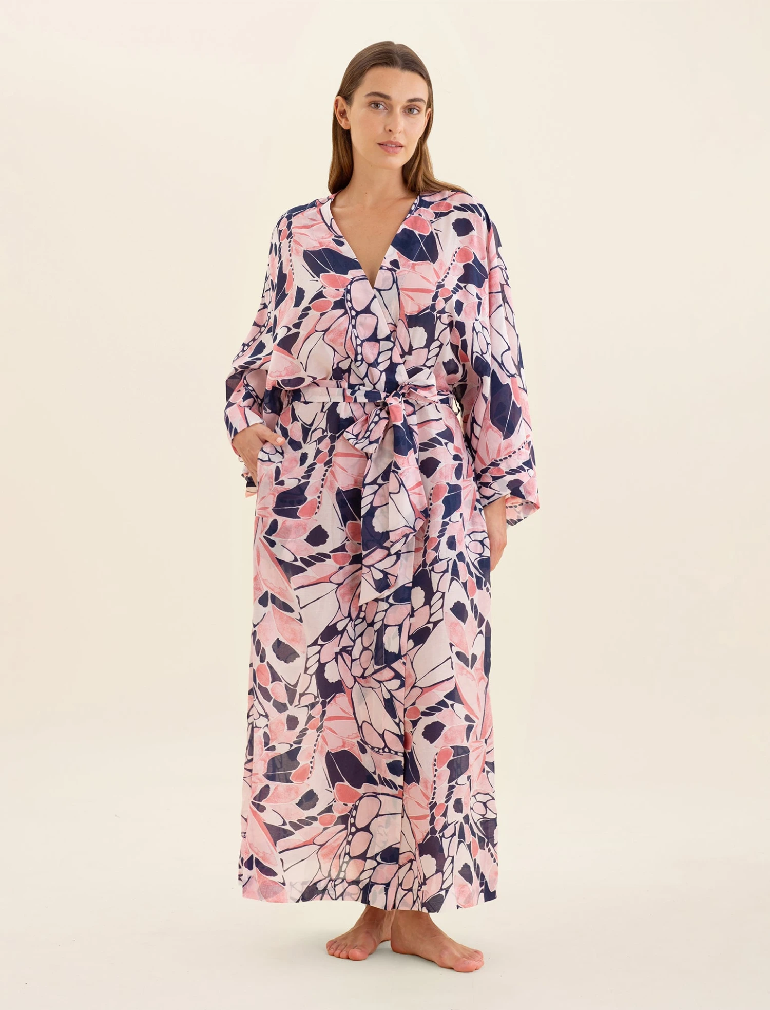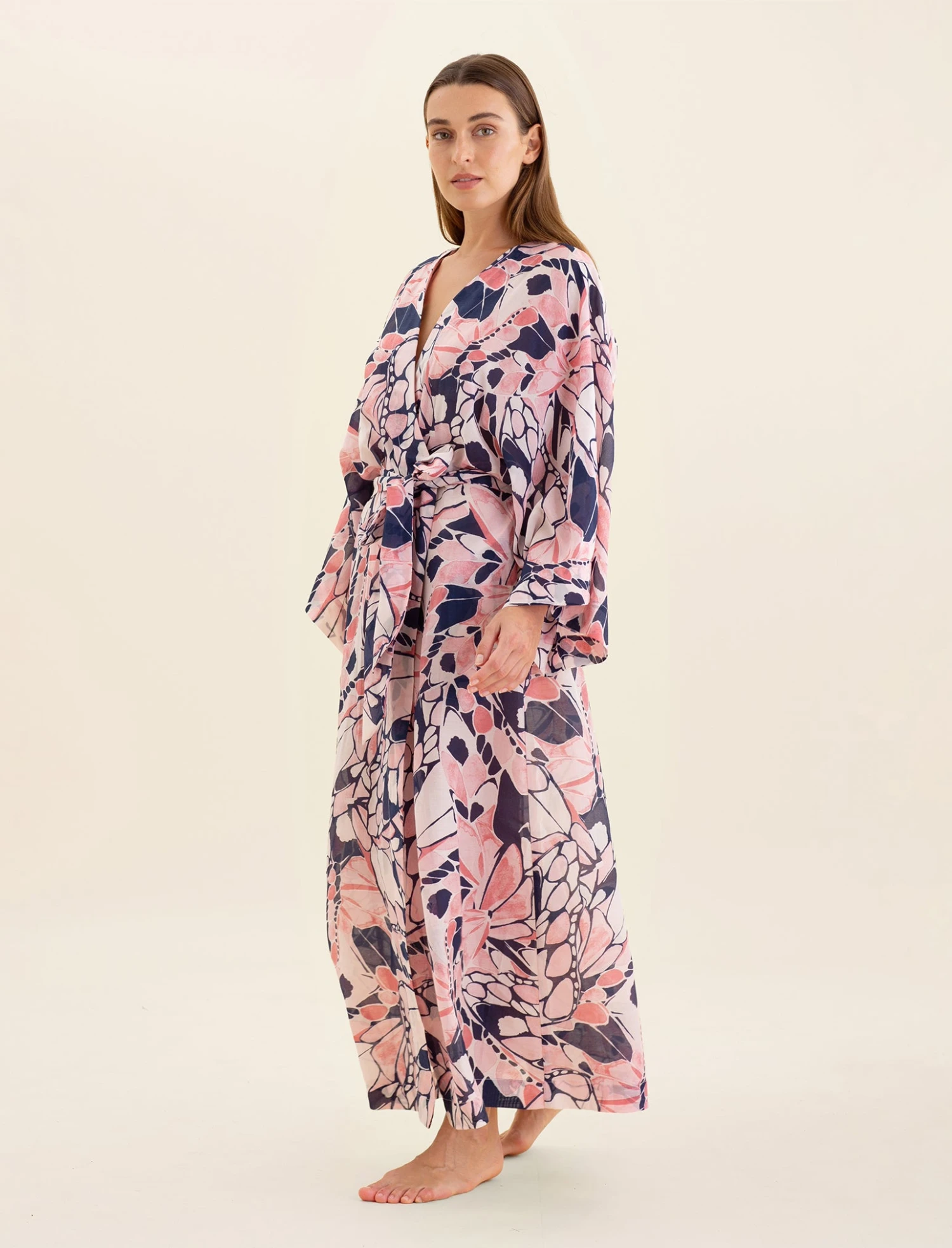 Dance in your dreams with fabric that mirrors your every move. Our lightest pure cotton fabrication breathes and moves with you. This dreamy floral kimono-style maxi robe is perfect all year long!