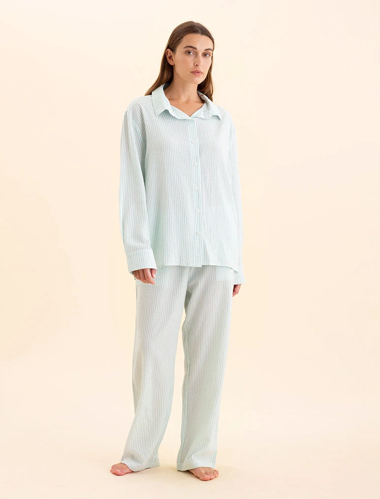 Our favorite boyfriend shirt is back in a divine pink seersucker stripe made from a blend of 50% Cotton and 50% certified Lenzingâ„¢ Ecoveroâ„¢ Viscose. The fabric has a super soft, cooling hand feel and is perfect for lounging around and jumping straight into bed everyday!