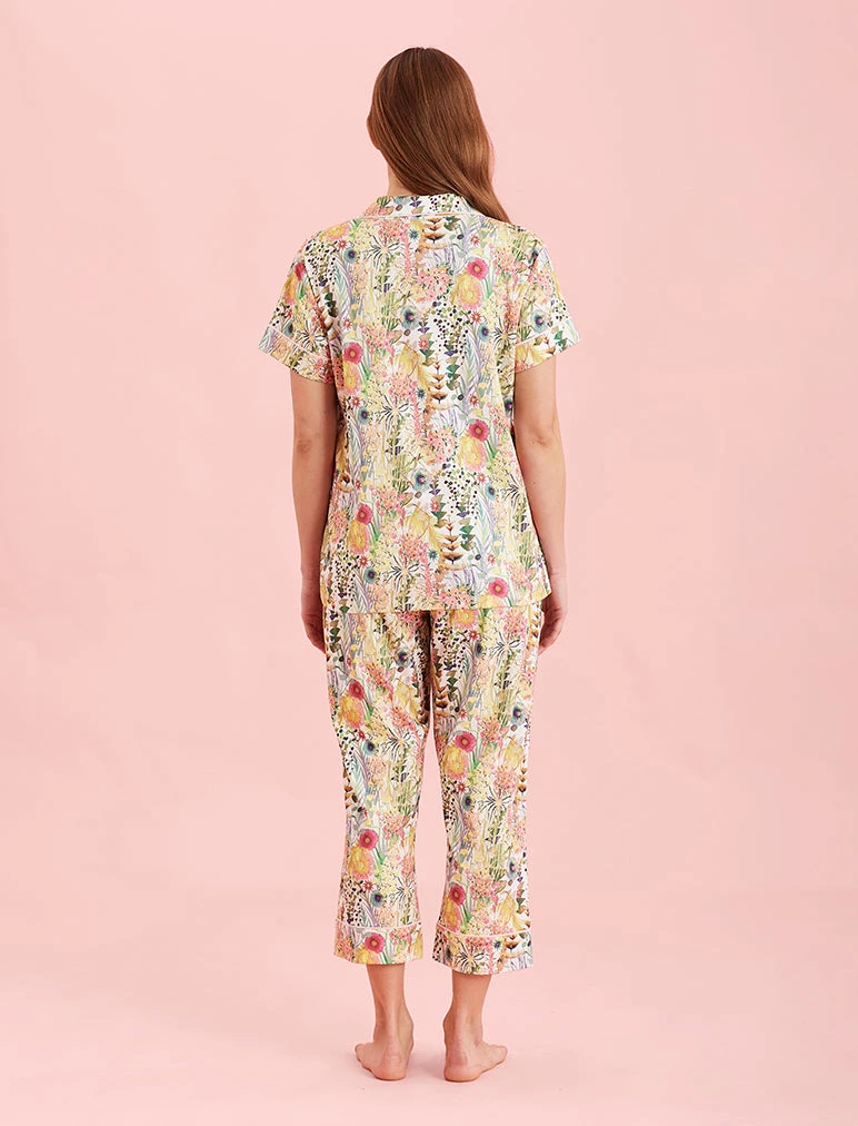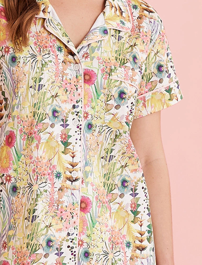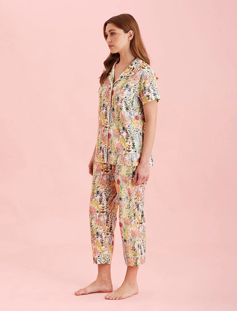 A limited edition premium capsule collection Made With Liberty Fabrics, pairing London charm with dreamy, luxurious Papinelle sleepwear. Tresco is a watercolor study that represents the rich collection of plants gathered from around the globe. The Liberty Fabrics print is formed from a selection of flowers, ferns and succulents from the windswept sand dunes and landscaped borders of the Abbey Garden.